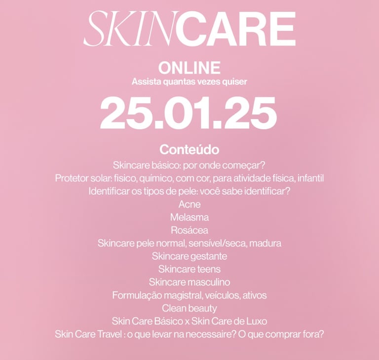 Nossas aulas oferecem uma abordagem completa ao universo do skin care, começando pelos fundamentos básicos e avançando até técnicas mais sofisticadas. Dedicamo-nos a temas relevantes como os cuidados específicos para a pele jovem, que incluem prevenção e tratamento de acne, além de rotinas adequadas para manter a saúde da pele do corpo. Também exploramos estratégias antienvelhecimento para peles maduras, focando no combate à senescência cutânea. Para gestantes, apresentamos cuidados seguros e eficazes que podem ser aplicados durante a gravidez. Por fim, discutimos o tratamento de condições específicas, como melasma, rosácea e peles sensíveis, garantindo que todos tenham as ferramentas necessárias para cuidar da sua pele de forma eficaz e consciente.