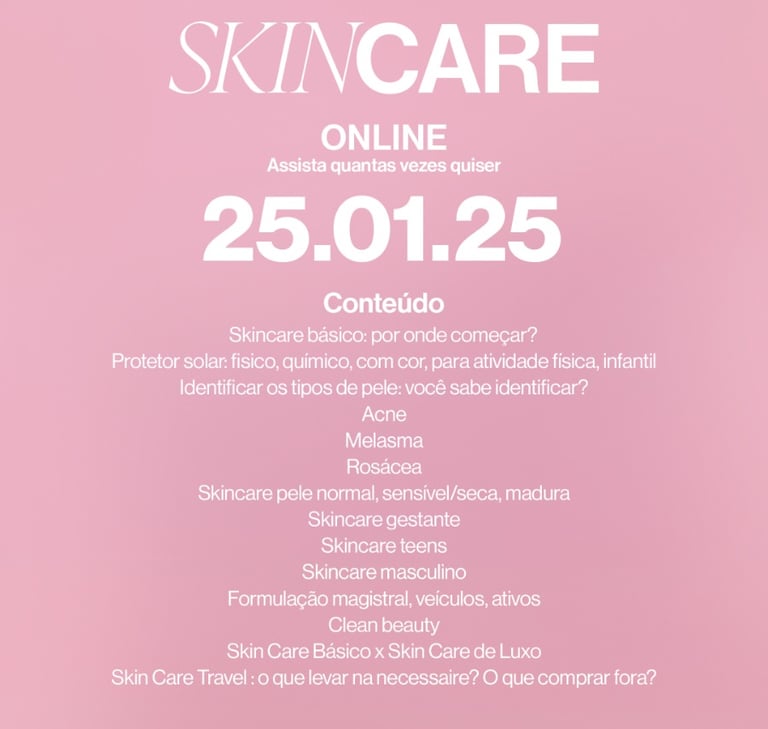 Nossas aulas oferecem uma abordagem completa ao universo do skin care, começando pelos fundamentos básicos e avançando até técnicas mais sofisticadas. Dedicamo-nos a temas relevantes como os cuidados específicos para a pele jovem, que incluem prevenção e tratamento de acne, além de rotinas adequadas para manter a saúde da pele do corpo. Também exploramos estratégias antienvelhecimento para peles maduras, focando no combate à senescência cutânea. Para gestantes, apresentamos cuidados seguros e eficazes que podem ser aplicados durante a gravidez. Por fim, discutimos o tratamento de condições específicas, como melasma, rosácea e peles sensíveis, garantindo que todos tenham as ferramentas necessárias para cuidar da sua pele de forma eficaz e consciente.